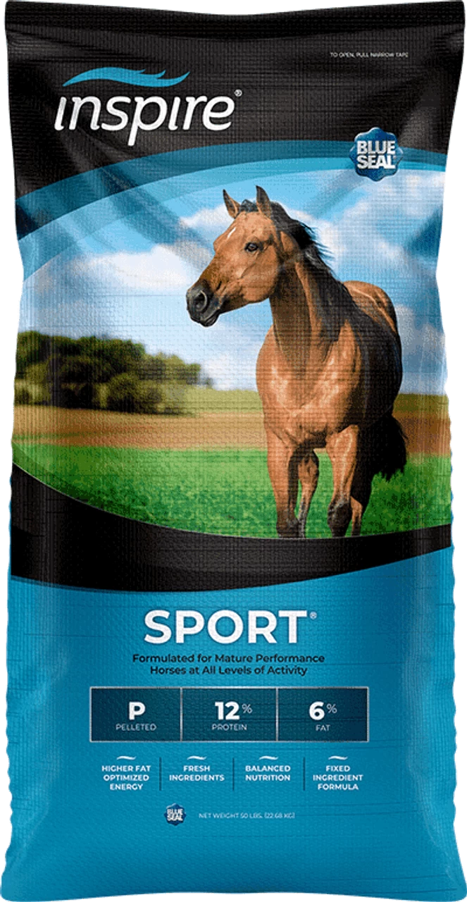 Blue Seal Inspire Sport is a low-protein, higher fat, pelleted grain designed for mature performance horses at all activity levels. It offers a convenient, higher calorie nutritional package for the life of your horse.