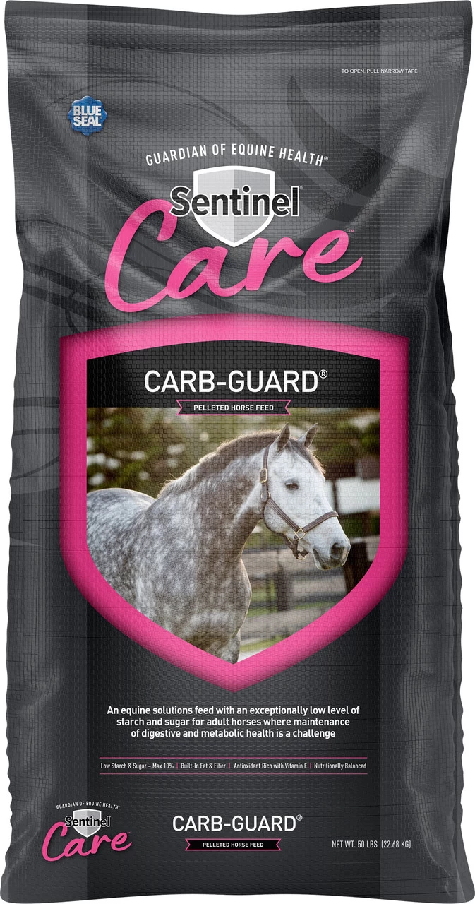 Blue Seal Sentinel Care Carb-Guard Pelleted Horse Feed, 50Lbs. is formulated with low starch and low sugar ingredients for adult horses where maintenance of digestive and metabolic health is a challenge. It is a nutritionally balanced, high-fat pellet formulated to contain a high level of fermentable fiber and an exceptionally low level of starch and sugar.