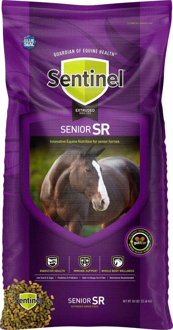 Blue Seal Sentinel Senior SR Extruded Formula Horse Feed, 50 Lbs. provides a highly fortified balance of nutrients and an exclusive blend of natural additives to meet the increased nutritional demands of senior horses due to less efficient digestive and metabolic systems. This unique formula is also recommended for certain horses where maintenance of digestive and metabolic health is a challenge. An extruded feed, Sentinel Senior offers a safe and natural way to provide essential nutrition that may be easily digested for optimal nutrition utilization.
