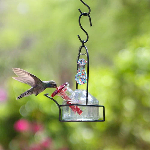 Clear glass hummingbird feeder with crystal droplet sparkles in the sun to attract tiny sprites!