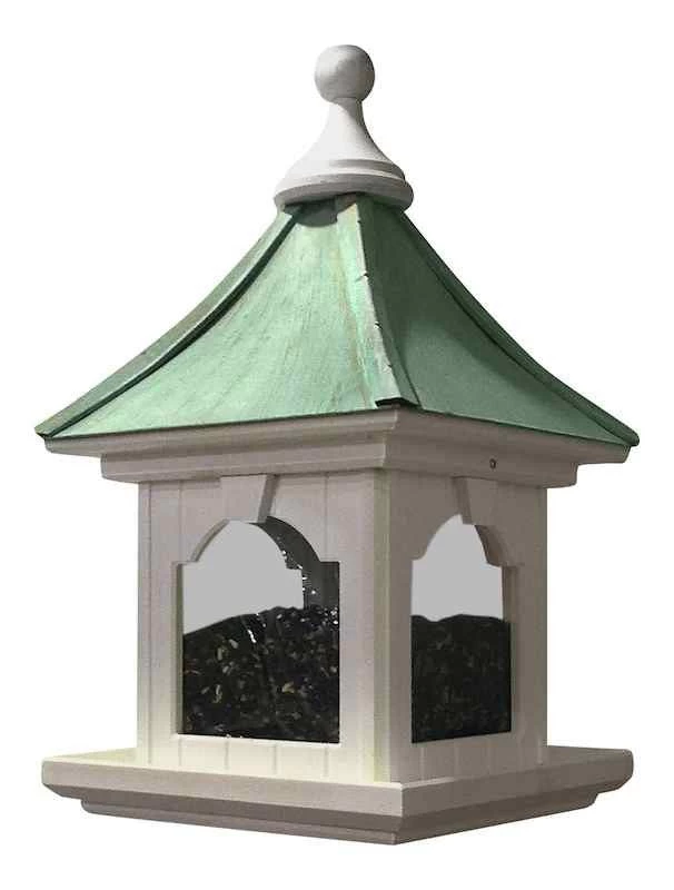 Hanging Copper Roof Bird Feeder in vinyl/PVC features a great big hopper that holds 8-10 lbs. of seed, even chunkier nut mixes!