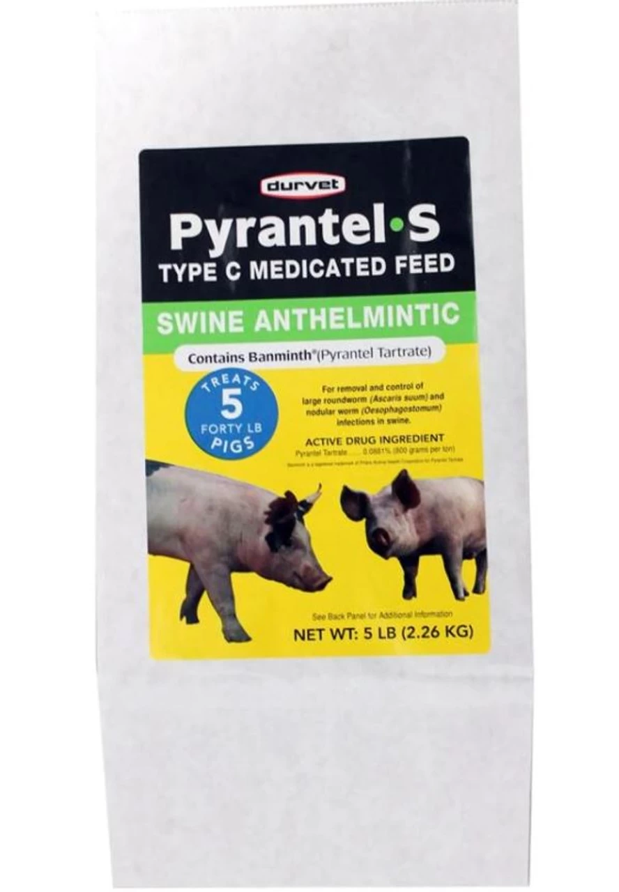 Durvet Pyrantel-S Swine Anthelmintic Feed, 5 Lbs. removes and controls large roundworms and nodular worms. Each 5lb. Bag treats five 40lb. Pigs, Easy to feed pellet form. Scoop included measures approximately 0.50 pounds(8oz.)
