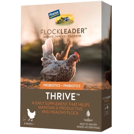 Directions for Use: Add one teaspoon of Thrive per gallon of water daily. For birds younger than 8 weeks old, we recommend FlockLeader Arrive. Makes 45 1-gallon servings and is safe for all poultry species.
