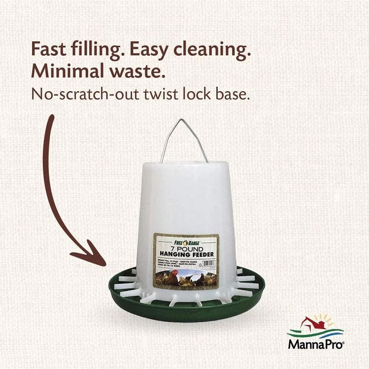 The Manna Pro® Free Range open-top 7-lb capacity feeder is designed for fast filling, easy cleaning and minimal waste of feed thanks to the no-scratch-out twist-lock base. Keep your chickens fed and conserve their food for less filling and cleaning.