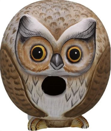 Expressive owl birdhouse is hand carved and painted using non-toxic paints and finishes with amazing attention to detail. Round, fat and whimsical (too much coffee?) he’s uniquely functional art for the garden. Providing a refuge for birds to nest and roost, Gordo-Owl will host many successful broods over the years!