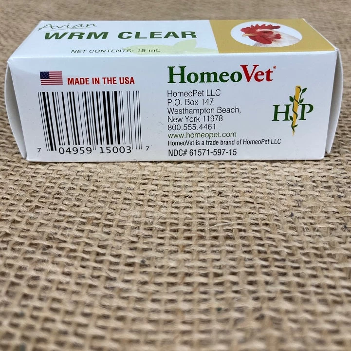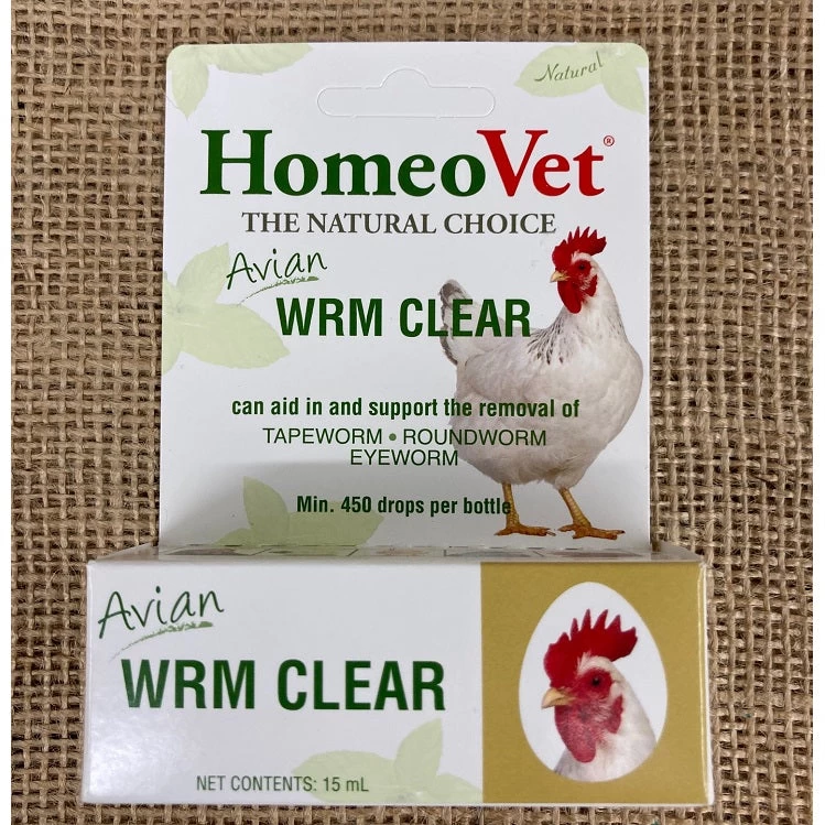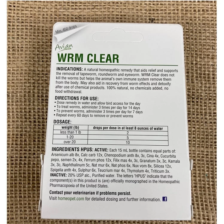 HomeoVet Avian Wrm Clear can aid in and support the removal of tapeworm, roundworm and eyeworm. WRM Clear does not kill the worms but can help the animal’s own immune system remove them from the body. May also aid in recovery from worm effects and detoxify from effects of conventional products. Natural pet medicine, no food withdrawal required.