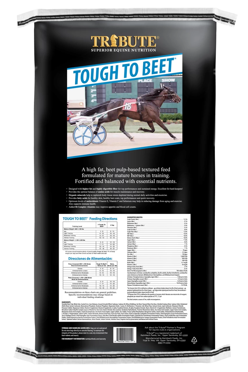 Kalmbach Feeds Tribute Tough To Beet Textured Horse Feed is a higher fat, beet pulp-based textured feed formulated for mature horses in training.