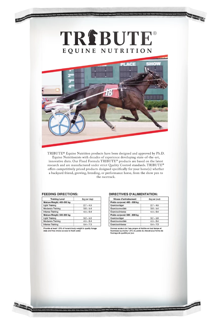 The Kalmbach Tribute Ultra Complete Textured Horse Feed is a high fat, high fiber textured feed designed for mature horses in training.