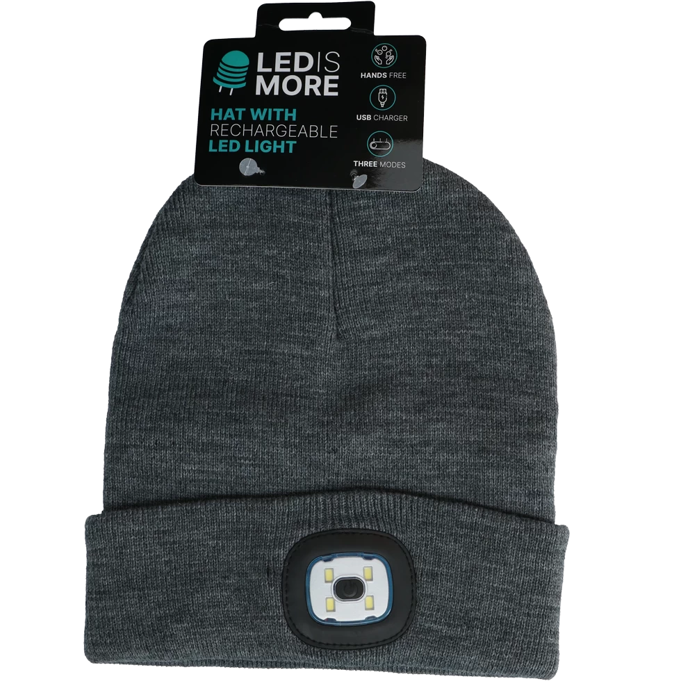 In het donker ook goed zichtbaar met deze muts met LED verlichting!