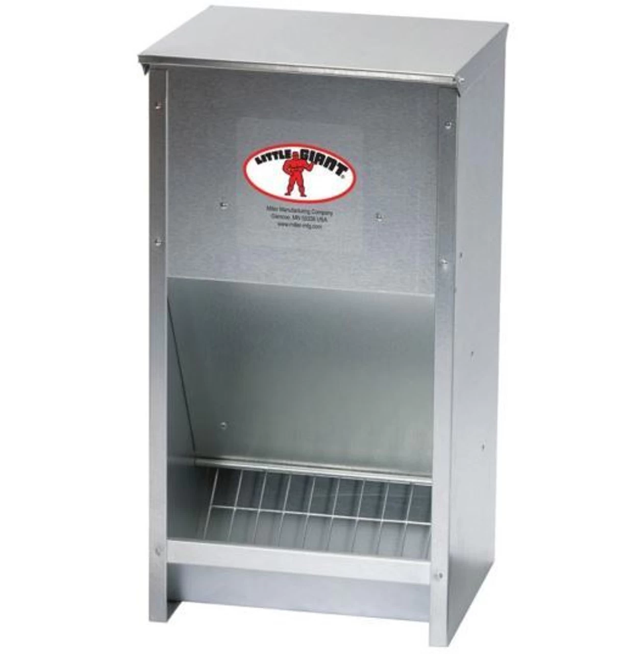 Little Giant High Capacity Steel Poultry Feeder, 25 Lbs. is completely assembled, made of tough, galvanized steel. Stores and dispenses up to 25 lbs. of mash, pellet or crumble feed.