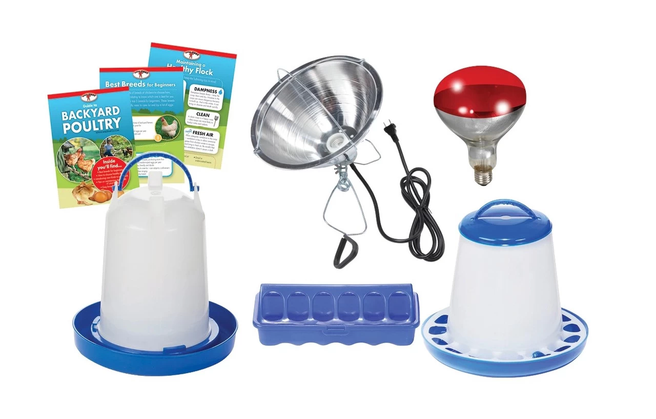 Miller Double-Tuf Beginner Poultry Kit contains everything you need to get your chicks started. INCLUDES: 250W red heat lamp bulband 10.5 reflector lamp toprovide safe heat 8 ground feeder 1.5-lb. plastic feeder 1.5-qt. plastic chick waterer