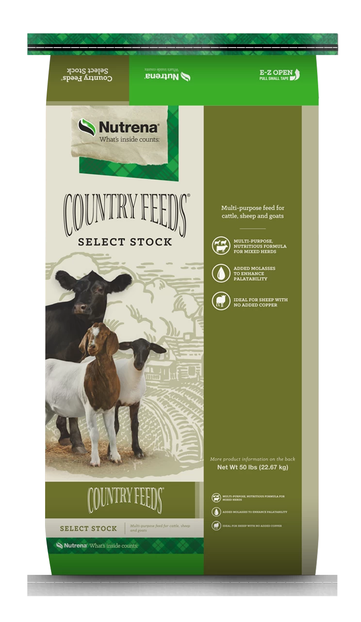 Nutrena Country Feeds Select Stock 16% Textured Feed is multipurpose, nutritious formula for mixed herds. Select high-quality grains—an economical source of energy. Added molasses to enhance palatability. Safe for sheep, no added copper.