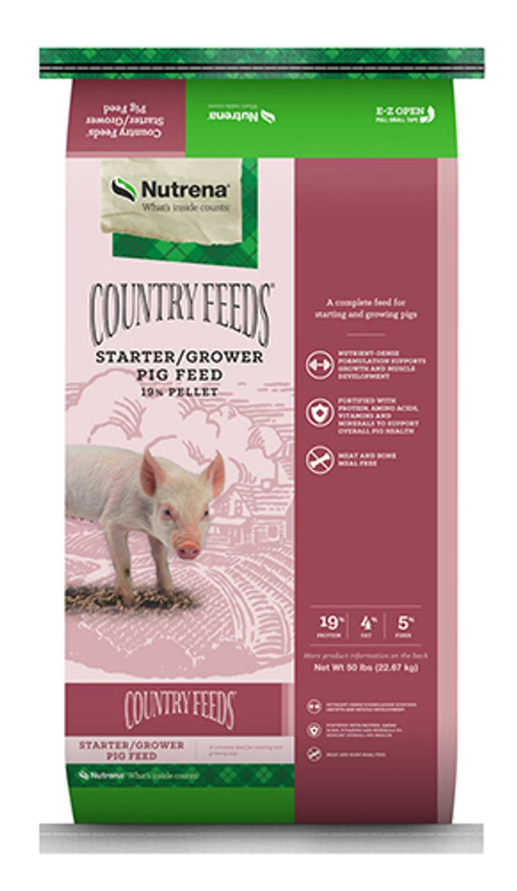 Nutrena Country Feeds Starter Grower Pelleted Pig Feed is a complete feed for starting and growing pigs
