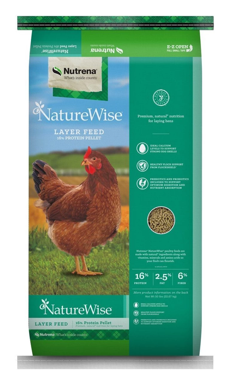 Nutrena NatureWise Egg Layer 16% Pelleted Feed is expertly designed and formulated layer feed for natural, balanced nutrition to support production of fresh, hard-shelled eggs in free-range and home-raised flocks.