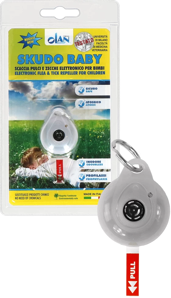 Aangezien kinderen gevoelig en kwetsbaar zijn, hebben ze soms extra bescherming nodig.Ā Skudo Baby is de natuurlijke en veilige oplossing welke geen risico’s met zich meebrengt.Ā Vlo-beten zijn vaak de oorzaak van allergische dermatitis,vanwege hun allergeenrijke speeksel.Ā Het apparaat geeft een reeks ultrasone impulsen die de parasieten storen. Stoort mensen en huisdieren niet, waardoor kinderen die in parken, tuinen of met hun hond / kat spelen, beschermd blijven.Ā De Skudo kan worden bevestigd aan de kinderwagen, de pols, de nek, (met het geperforeerde deel richting de huid). Zodra het rode lipje is verwijderd, werkt het apparaat continu voor 10/12 maanden dankzij een niet-oplaadbare batterij.Ā Het is vocht-en waterbestendig en gebruikt geen vervuilende chemicaliĆ«n.Ā Formaat3,5 x 2,9 x 1,9 cm