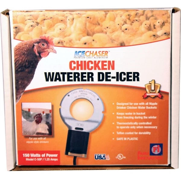 Fresh water is essential for the health of your birds, and keeping it readily available throughout the bitter winter poses a challenge in the cooler climates. This electric de-icer has 150 watts of power and is designed for use with all nipple-drinker style poultry water buckets. Constructed of patented cast aluminum for ultimate efficiency and safety, and Teflon coated for durability, the unit is thermostatically controlled to operate only when necessary.