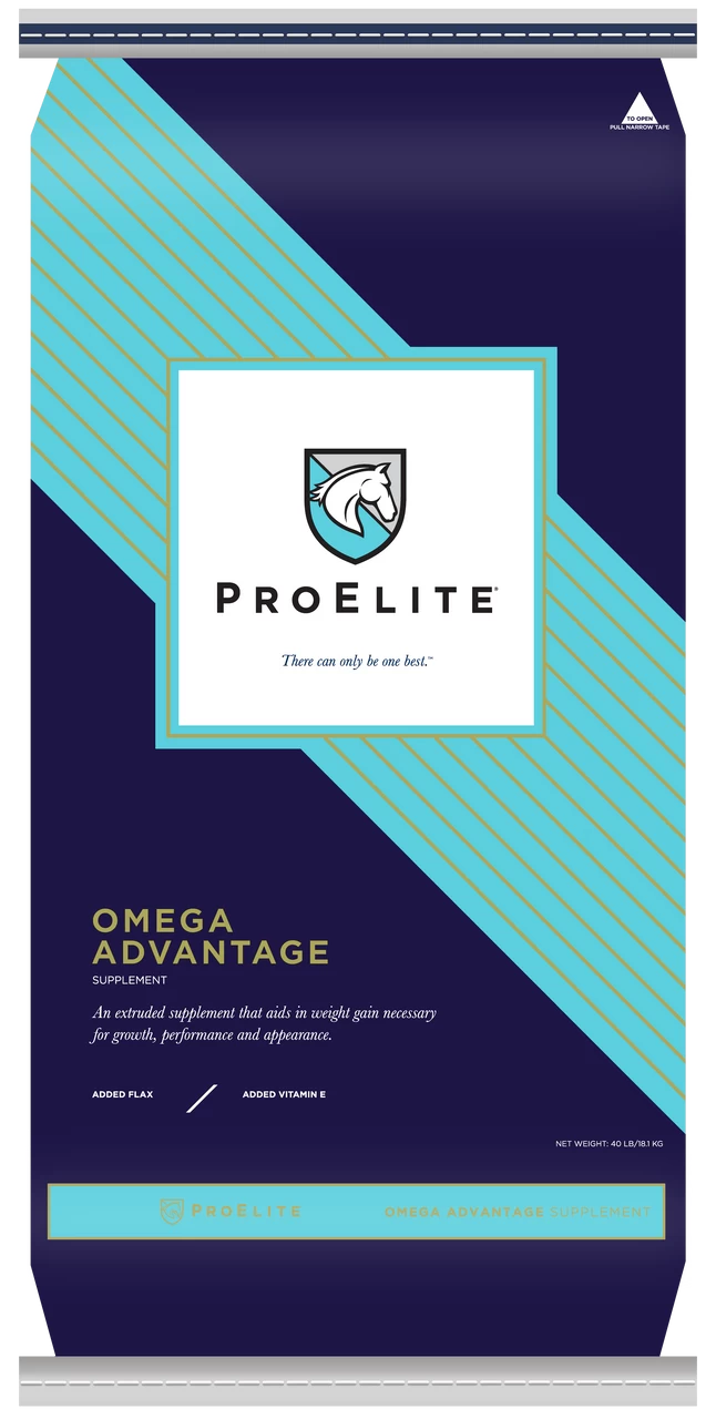 ProElite Omega Advantage Supplement Pelleted Horse Feed, 40 Lbs. is an extruded supplement that aids in weight gain necessary for growth, performance, and appearance. Has added flax, contains 24% fat, & added vitamin E.