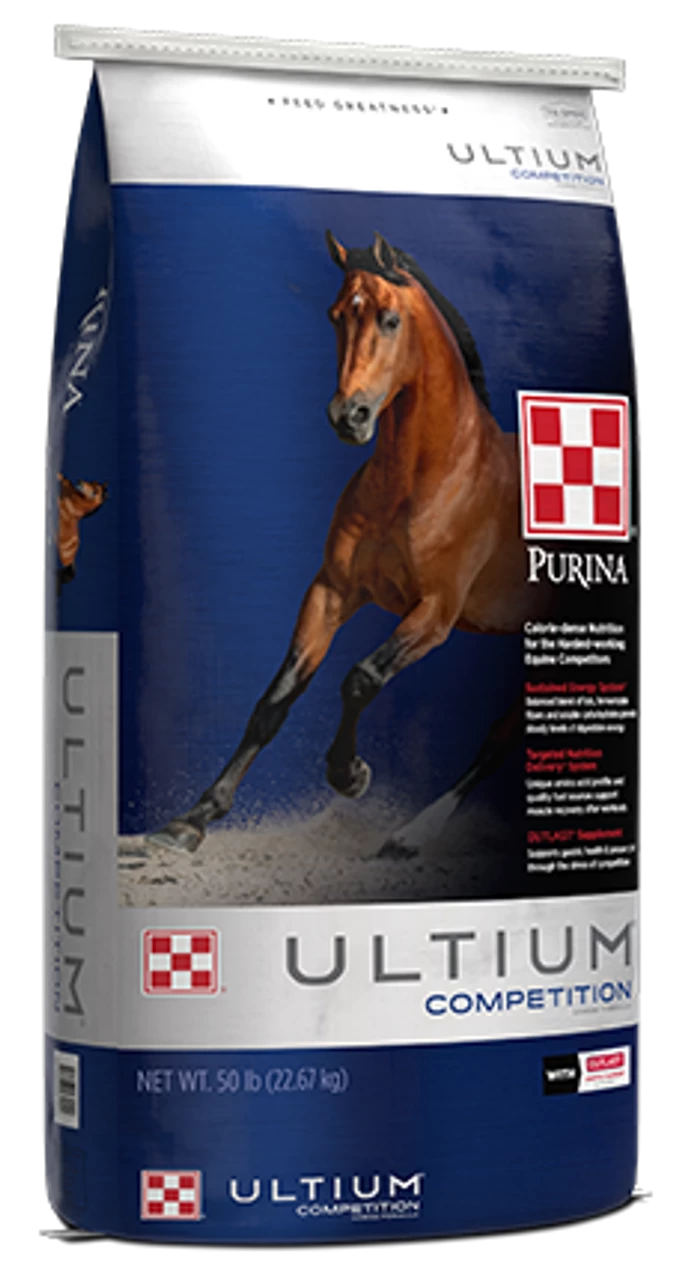 Purina® Ultium® Competition Horse Formula is designed for world-class equine athletes, allowing them to compete at their highest levels. Ultium® Competition Horse Formula delivers a concentrated amount of energy to these working horses, by distributing this energy over several different sources (vegetable oils, beet pulp and a proprietary mix of other sources). Because this feed is energy dense, less feed is required for maintenance of body condition when compared to feeds with lower energy density, such as straight grains. Ultium® Competition Horse Formula delivers mental focus and manageability, quick recovery and muscle repair, prolonged stamina, a strong top line and less digestive upset.”
