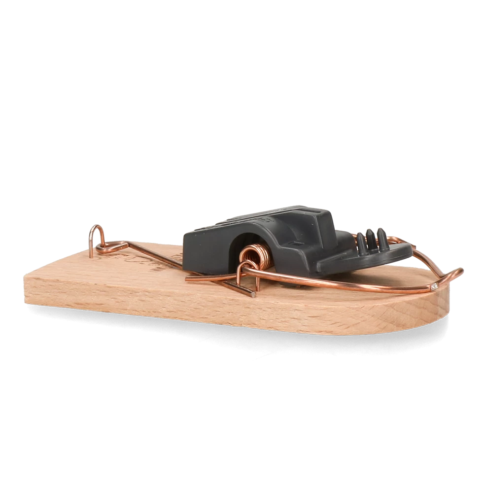 Sterke muizenval van FSC hout met krachtige slag.
