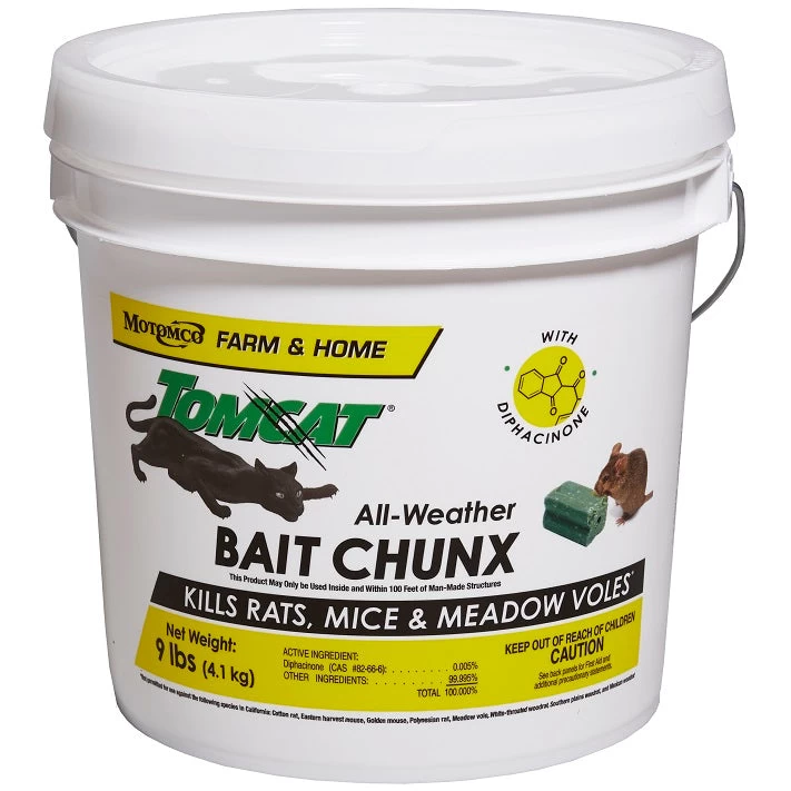 Tomcat All-Weather Bait Chunx are a popular option, delivering proven Rodent Control results to homeowners and farmers for decades. Made with the multiple feed, first generation anticoagulant Diphacinone, Tomcat Bait Chunx are an economical option for everyday control of light to moderate infestations. With proven bait acceptance and palatability, Tomcat Bait Chunx can be used in variety of baiting situations. Motomco’s unique, proprietary extrusion process produces Bait Chunx with multiple edges that appeal to a rodent’s desire to gnaw. Tomcat Chunx are made with food-grade ingredients and small amounts of paraffin for a highly palatable bait. Tomcat Bait Chunx can be easily placed on rods in a bait station or secured using nails or wire.