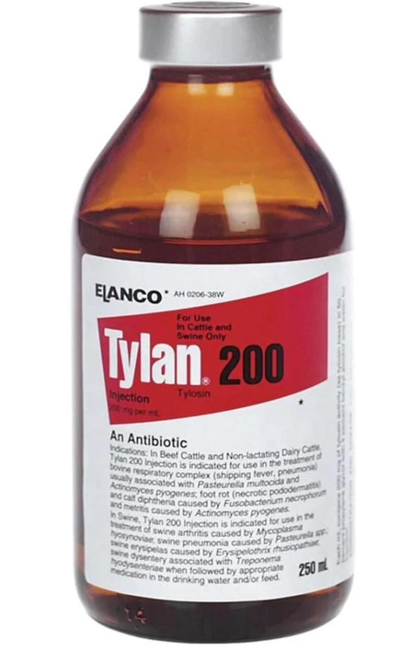 Tylan 200 Injection For Cattle & Swine, 250 ML. is an intramuscular injection. Treats pneumonia, mycoplasma arthritis, dysentery and erysipelas in swine. Treats pneumonia, shipping fever, metritis, diphtheria and foot rot in cattle. Treatment should be continued for 24 hours following remission of disease signs. Made in the USA.