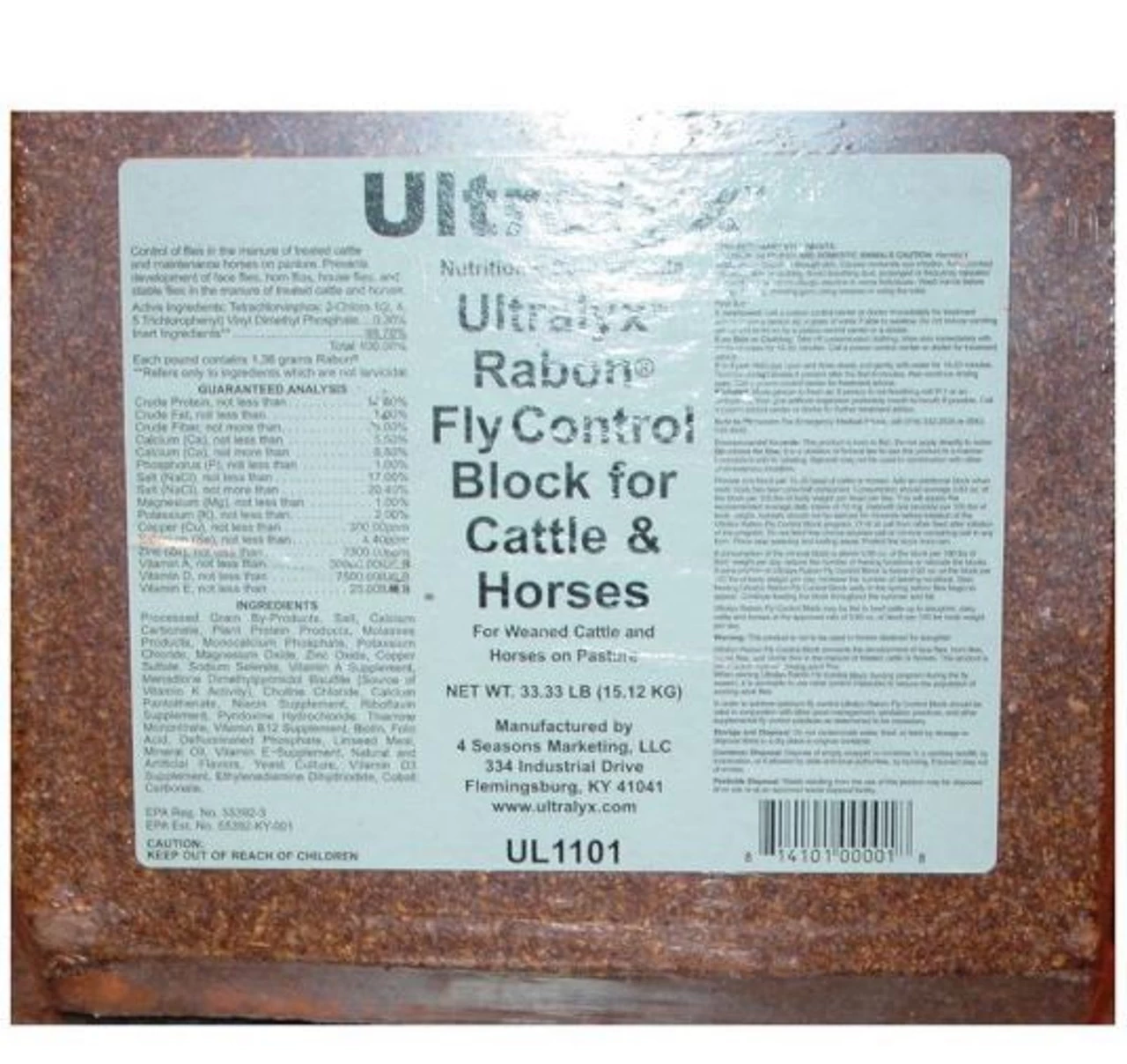 Ultralyx Rabon Fly Control Block For Cattle & Horses, 33.33 Lbs is a convenient, free choice fly control for weaned cattle and horses on pasture. Highly palatable source of natural protein, energy, minerals and vitamins with no additional salt added.